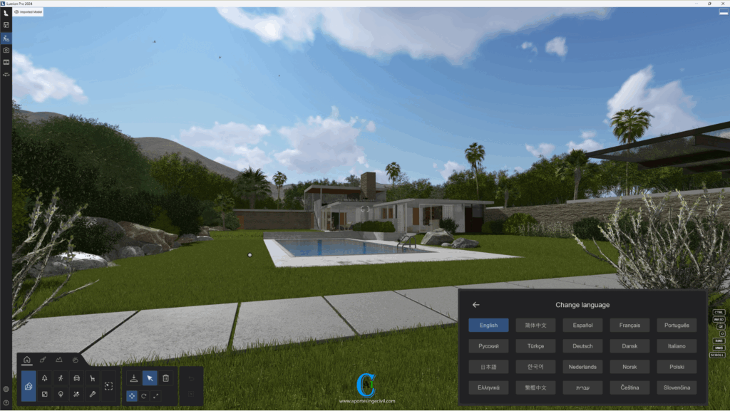 Acceda a una biblioteca avanzada con miles de objetos, materiales realistas, cielos, vegetación y efectos climáticos, junto con funciones avanzadas de render y animación.